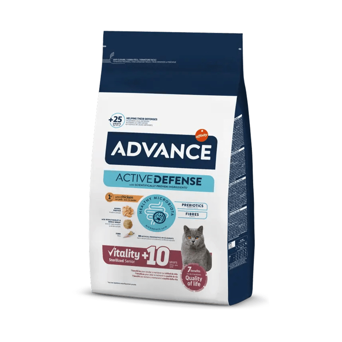 ACTIVE DEFENSE STERILIZED SENIOR, sont des croquettes pour chats stérilisés de plus de 10 ans, riche en fibres, protéines et minéraux avec un apport réduit en matière grasses et en énergie métabolisable qui vont permettre de contribuer à la bonne santé du chat vieillissant en préservant sa masse musculaire ainsi que sa bonne santé urinaire en évitant la formation de calculs urinaires.