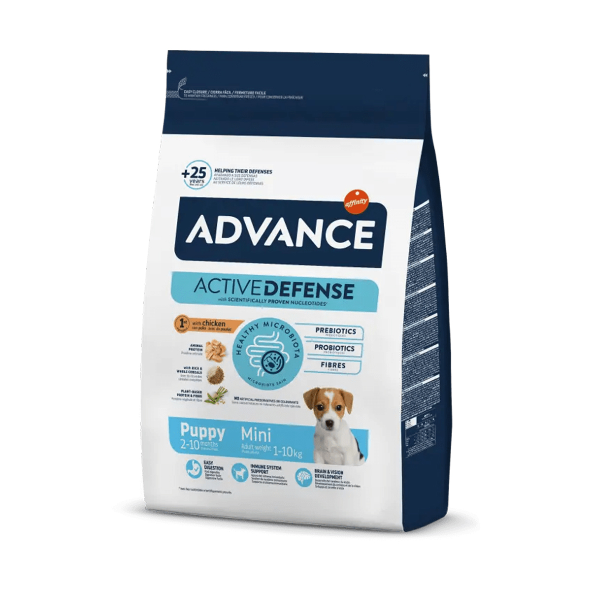 Les croquettes Advance Mini Puppy Protect au poulet pour Chiot de Petite Taille sont préconisées pour des chiots de petite taille (de moins de 10kg à l’âge adulte) de 2 à 10 mois, ainsi que pour des femelles gestantes ou allaitantes.