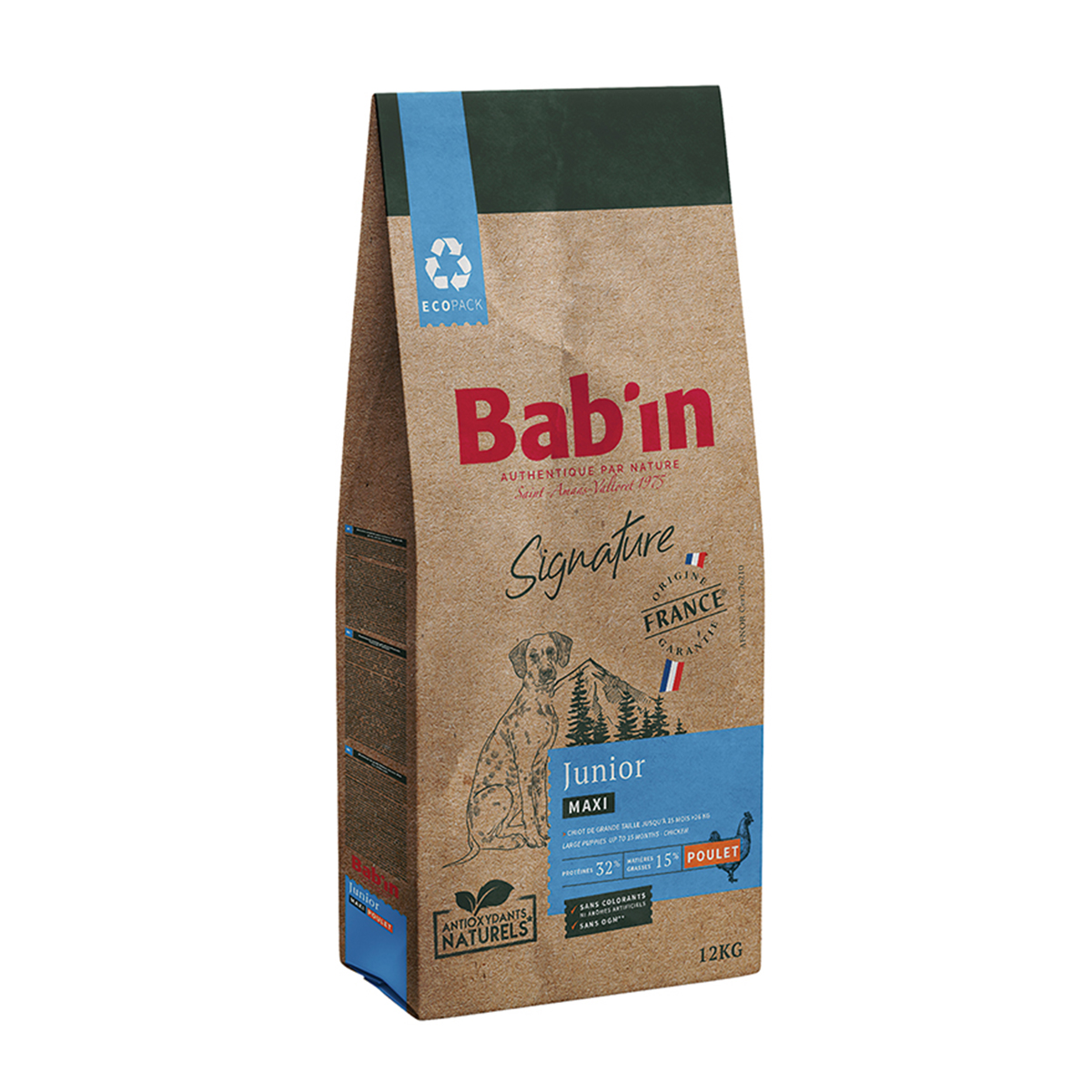 BAB’IN MAXI JUNIOR est un aliment de choix pour les chiots de grande taille qui nécessitent une croissance lente et contrôlée, grâce à une énergie métabolisable raisonnée, un apport en calcium et phosphore modéré. Riche en poulet et riz, combiné à un complexe de prébiotiques (FOS & MOS), il aide au bon équilibre de la flore intestinale et contribue à la sécurité digestive du chiot. Il convient également aux chiots de taille géante de 4 à 12 mois.