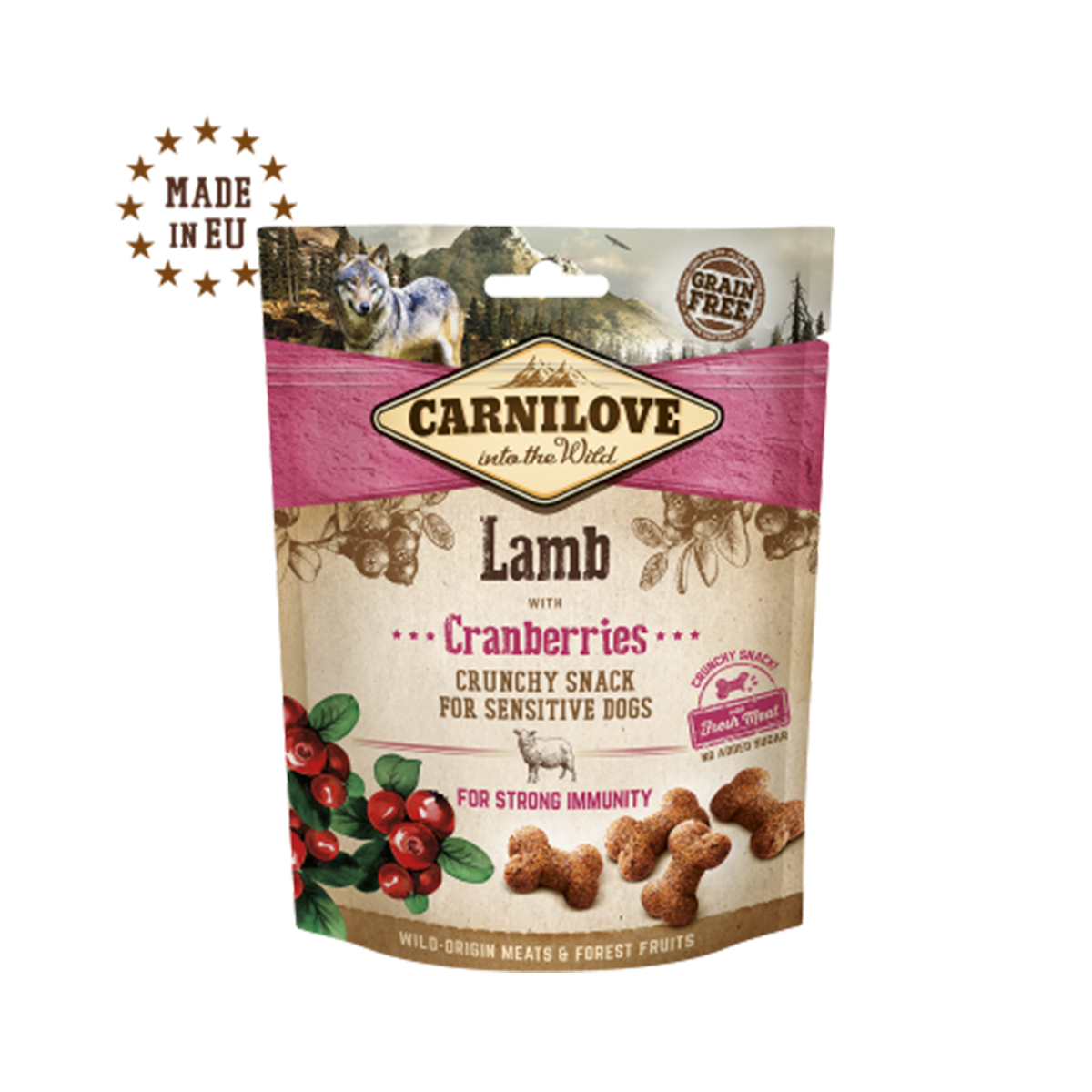 UNE DÉLICIEUSE FRIANDISE À L’AGNEAU CONVENANT AUX CHIENS SENSIBLES. AVEC DES AIRELLES, UNE SOURCE NATURELLE D’ANTIOXYGÈNES POUR RENFORCER L’IMMUNITÉ.