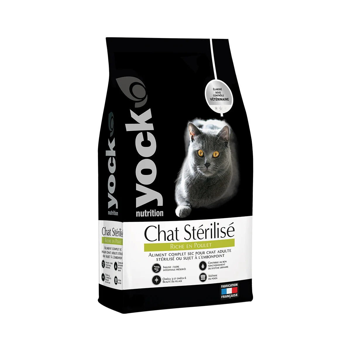 Yock Nutrition Chat stérilisé est un aliment complet sec pour les chats et chattes adultes stérilisés de toutes races qui ont des besoins caloriques spécifiques en raison de leur stérilisation.