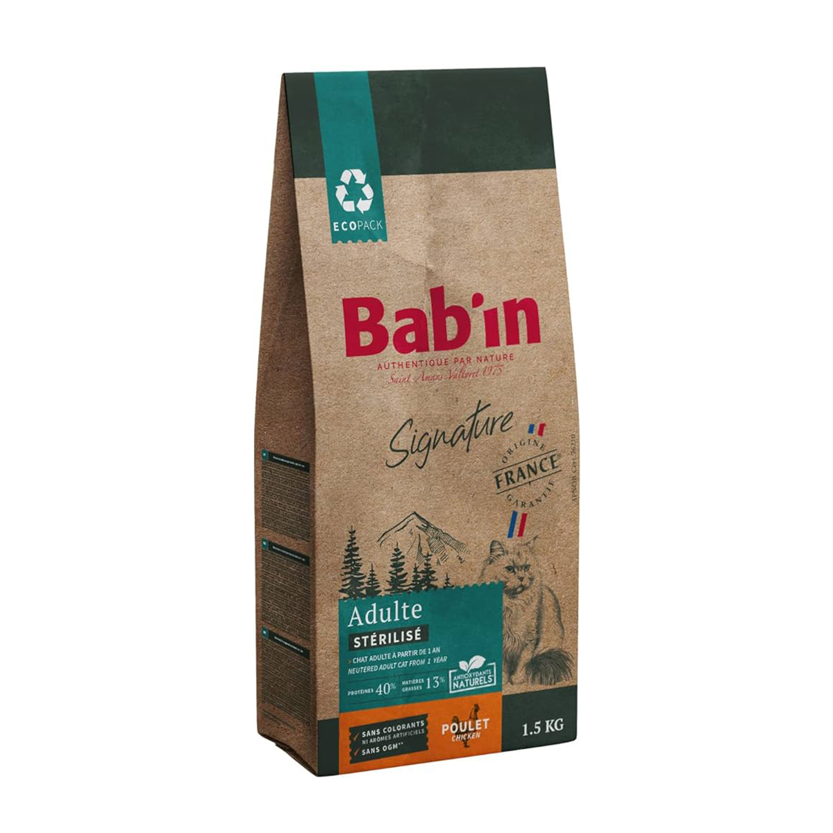 BAB’IN SIGNATURE CHAT ADULTE STÉRILISÉ, riche en poulet, est un aliment hautement digestible, favorisant un pelage sain et brillant, grâce à son complexe de levure de bière, de graines de chia et d’acides aminés soufrés. Il favorise la bonne santé des voies urinaires (pH et apport minéral contrôlé). Il participe au soutien articulaire et à l’hygiène dentaire. Convient au chat non stérilisé et stérilisé.