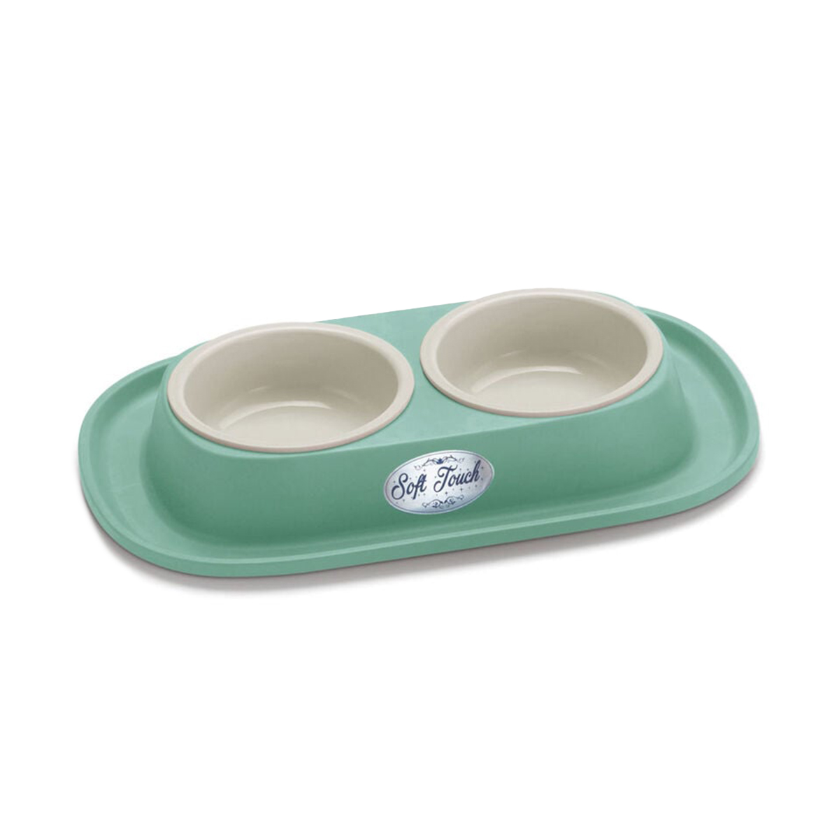 Bols amovibles en plastique 2x Ø 9,5 cm chacun avec porte-bols en caoutchouc souple anti-fourmis ; Disponible en couleurs assorties, Dimensions en cm : 31 x 20 x 3,5h, Bols Ø 2 x 9,5 cm, Capacité 230 + 230 ml