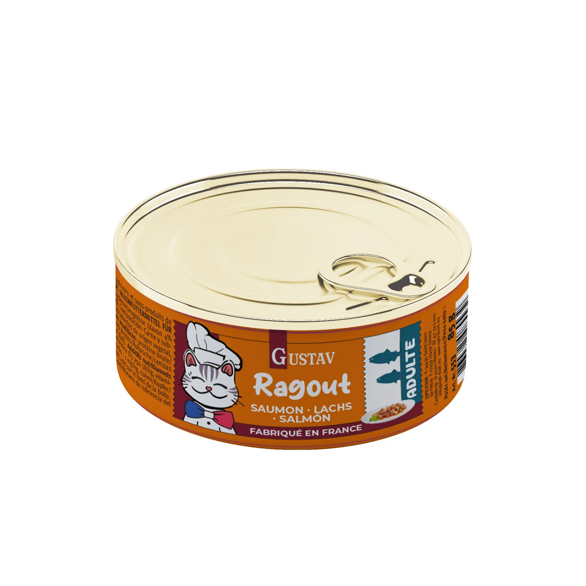 Disponible en trois saveurs gourmandes – Saumon, Veau et Poulet – le GUSTAV Ragoût pour chat permet de varier les plaisirs au quotidien. Chaque recette apporte des protéines de qualité et un goût authentique, pour combiner équilibre nutritionnel et plaisir gustatif. Offrez à votre compagnon une alimentation qui éveille ses sens tout en respectant ses besoins.