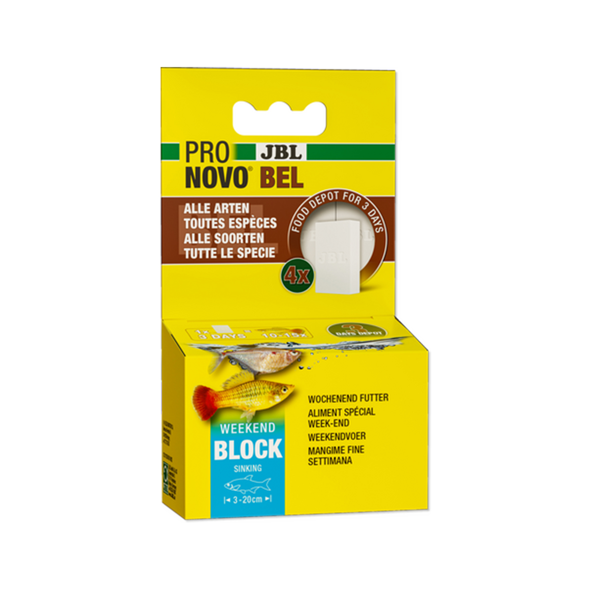 - Utilisation : déposer le bloc alimentaire dans l’aquarium. Il tombe au fond de l’eau et fournit de la nourriture pendant 3 jours à environ 15 poissons d’ornement (de taille jusqu’à 20 cm).
