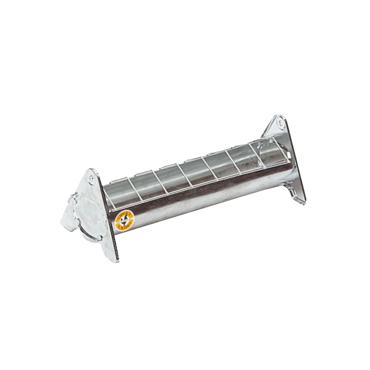 Mangeoire poussin à grille mobile. Tôle galvanisée. Augette de 4 cm de profondeur. Avec pied solidaire. Pour 10 poussins.