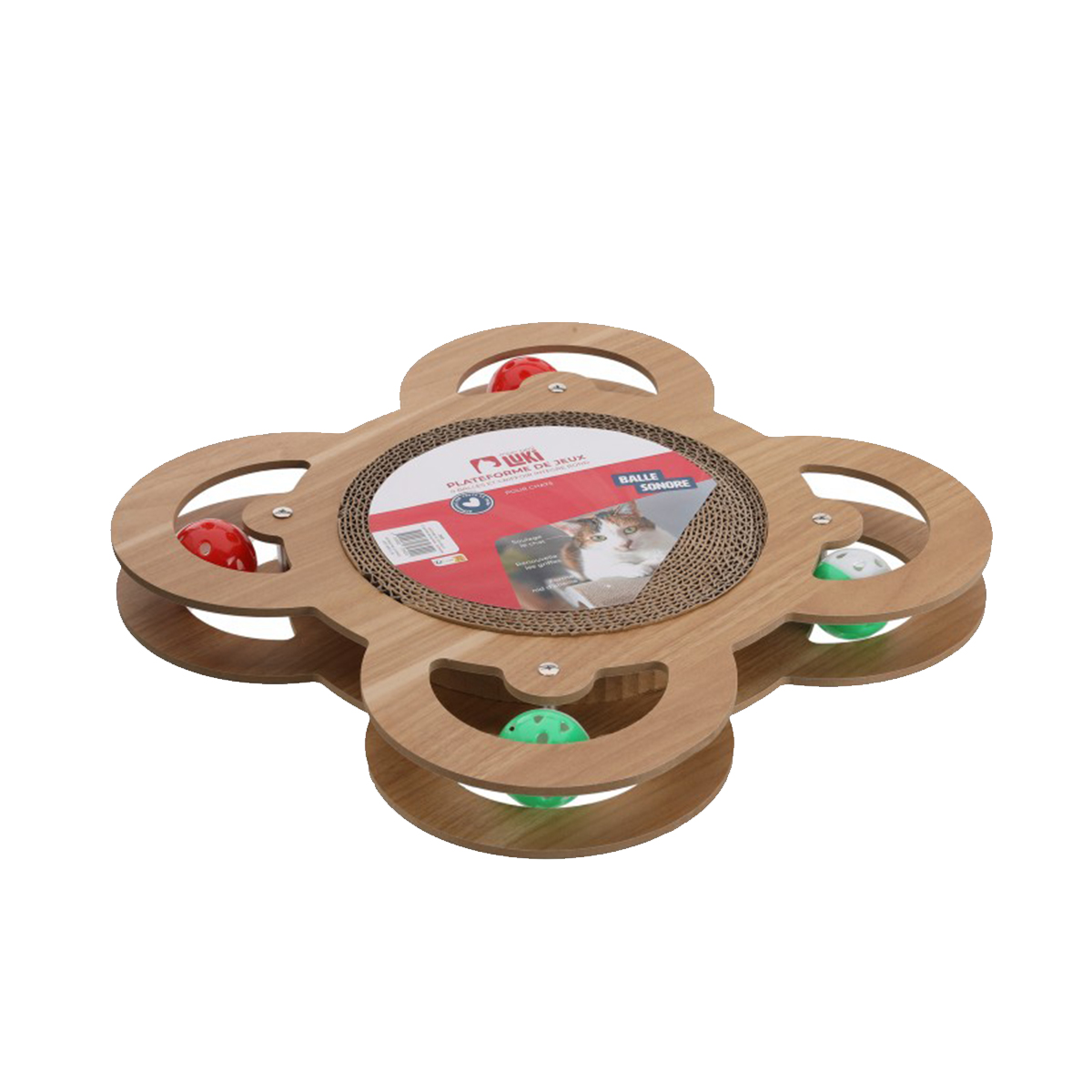 Plateforme de jeux éducatives 4 balles et griffoir intégré rond 35x35x4cm – couleur naturelle – amuse votre chat et lui permet de se faire les griffes.