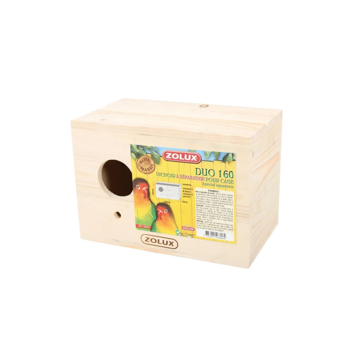 Destiné aux agapornis, ce nid de reproduction est composé de deux chambres, d’un perchoir et d’une ouverture pour faciliter son nettoyage. Fait en bois massif pour créer un environnement naturel.
