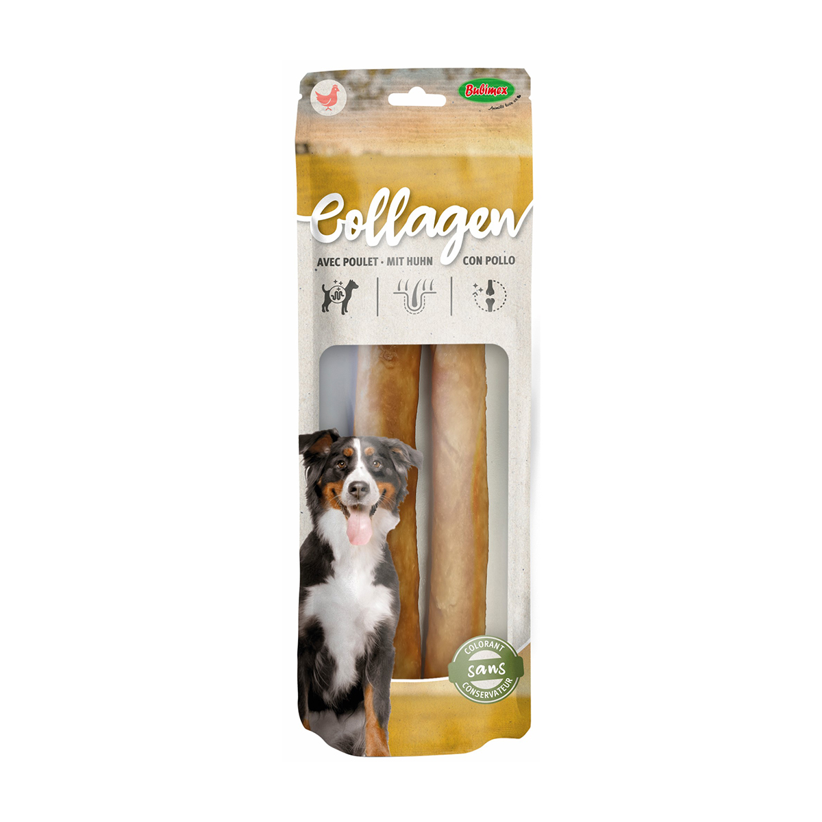 Découvrez la gamme Collagen de Bubimex, des friandises à mâcher riches en protéines et composées à 65% de gélatine de bœuf, source naturelle de collagène. Alternative digeste à la peau de buffle, le collagène est protéine naturelle qui contribue à la santé de la peau, du pelage, des os et peut aider à maintenir la mobilité des articulations.